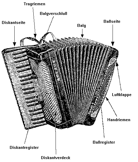 Das Akkordeon gehört zu der Gruppe der Handzuginstrumente. Außer dem Akkordeon kennen wir im wesentlichen auch das Bandoneon, die Concertino und die Handharmonika. Alle besitzen einen Faltenbalg. Um musizieren zu können, werden mit den Fingern Knöpfe oder Tasten betätigt. Gleichzeitig wird der Faltenbalg auseinandergezogen oder zusammengedrückt. Dadurch wird die außenbefindliche Luft eingesogen oder die innenbefindliche Luft hinausgedrückt. Im Instrument eingebaute freischwingende Stimmzungen werden durch diese Luftströmungen zum Schwingen gebracht, die vom menschlichen Ohr als Töne wahrgenommen werden. Je nach Spielweise erklingen Einzeltöne oder Akkorde. Die auf der Baßseite zu Akkorden gekoppelten Töne gaben dem Instrument den Namen "Akkordeon".
