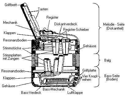 den im Innern des Instruments liegenden Stimmstöcken. Wesentlicher Teil der Diskantmechanik ist auch die in das Verdeck eingelassene Registerleiste mit der im Innern liegenden Registermechanik. Sinngemäß gilt das gleiche für den Baßteil. Die Baßmechanik ist gegenüber der Diskantmechanik ungleich komplizierter. Das hat seinen Grund in der nur dem Akkordeon und der Handharmonika eigenen Verkoppelung der Bässe und Akkorde. Zur Baßmechanik gehört schließlich noch die Luftklappe, die beim Spiel nicht verwendet wird und nur dem lautlosen Öffnen und Schließen des Balges dient. |