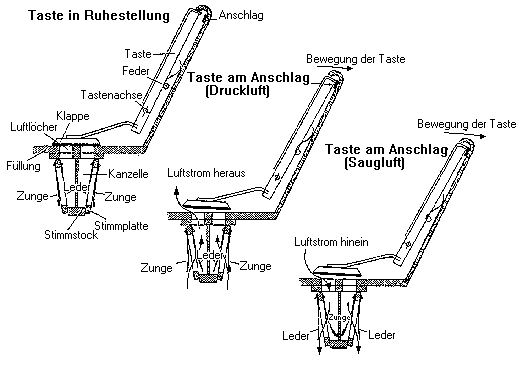 Jede Stimmplatte enthält zwei Stimmzungen, von denen eine auf Saugluft, die andere auf Druckluft anspricht.