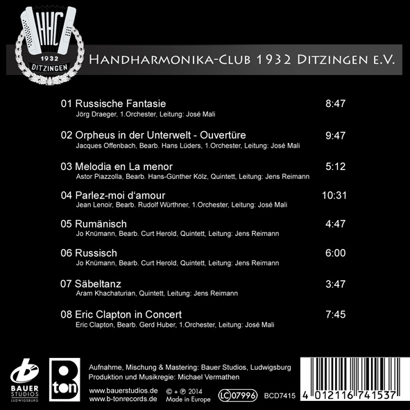 Unser 1.Orchester und unser Quintett haben zusammen in den Bauer-Studios in Ludwigsburg eine sehr abwechslungsreiche Studio CD eingespielt, die Sie natürlich käuflich erwerben können. Die professionell hergestellte CD wird im Hardcover und in Folie eingeschweißt geliefert. Mit dem Kauf unterstützen Sie unsere Arbeit und der Erlös dient ausschließlich der Refinanzierung unserer Produktionskosten. Die CD kann entweder per Email-Bestellung an info(at)hhc-ditzingen.de (EUR 15,-, inkl. Versand) oder über Amazon unter dem folgenden Link bestellt werden: