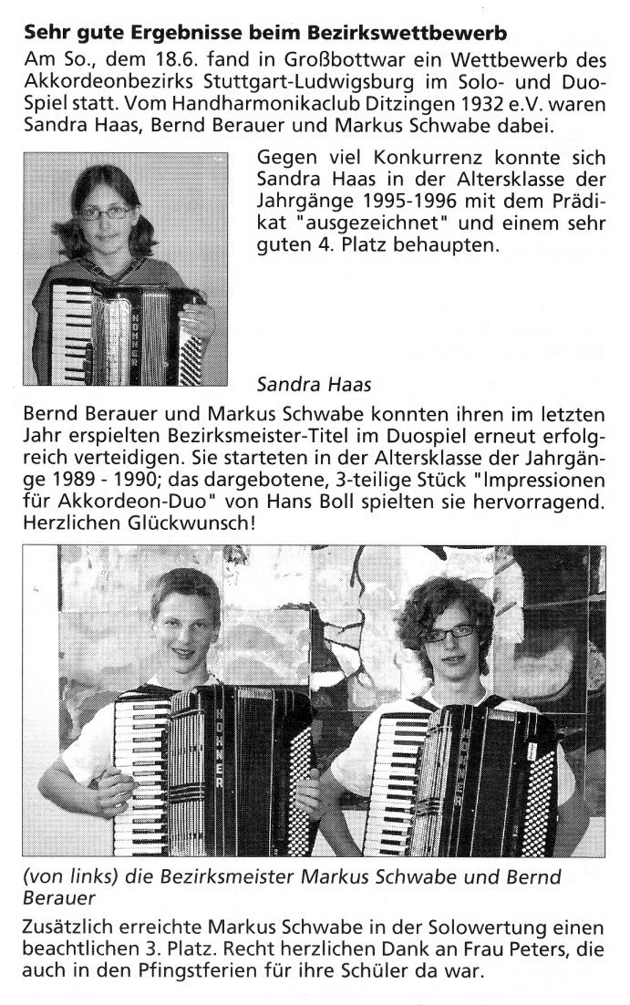 aus dem Ditzinger Anzeiger vom 22.06.2006 leider hat sich auch hier der Fehlerteufel in den Artikel eingeschlichen: Sandra Haas hat den 3.Platz belegt! |