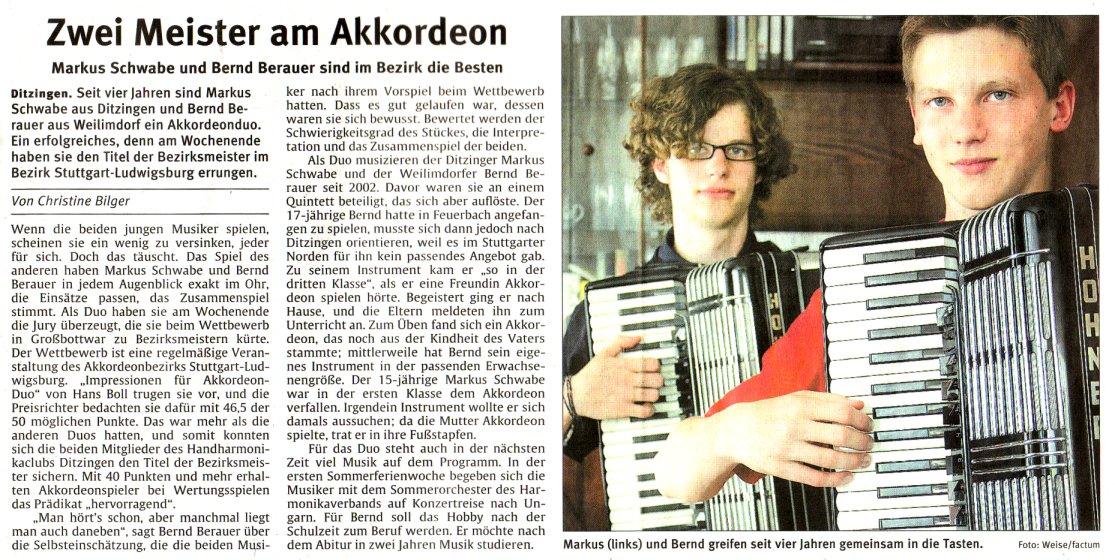 aus der Stuttgarter Zeitung vom 22.06.2006 leider hat sich der Fehlerteufel in den Artikel eingeschlichen: richtigerweise ist Markus Schwabe 16 Jahre alt und im Bild rechts zu sehen. Bernd Berauer ist im Bild links zu sehen. |